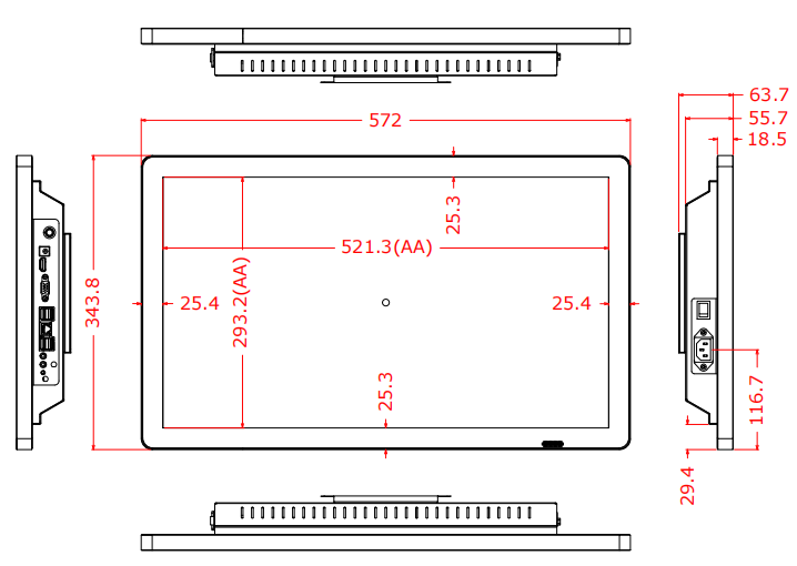 整机外形尺寸 | 572.0mm *343.8mm*55.7mm(自带壁挂支架厚度63.7mm) |